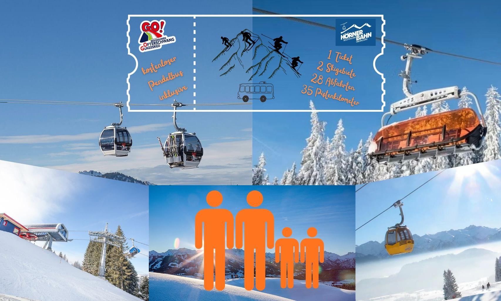Mit nur einem Ticket können Sie ihren perfekten Skitag vollkommen nutzen. Zur Verfügung stehen gleich zwei Skigebiete mit insgesamt 35 vielfältigen Pistenkilometern für Groß und Klein. Bei optimaler Schneelage haben Sie auf 28 Abfahrten feinsten Skigenuss und die Möglichkeit mit dem kostenlosen Pendelbus zwischen der Hörnerbahn und der Bergbahn Ofterschwang-Gunzesried je nach Belieben zu pendeln. Insgesamt sind bis zu 13 Anlagen/Lifte nutzbar (ja nach tatsächlicher Schneelage).