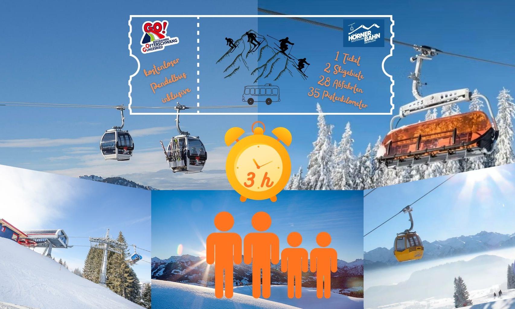 Mit nur einem Ticket können Sie 3 Stunden für ihren perfekten Skitag vollkommen nutzen. Zur Verfügung stehen gleich zwei Skigebiete mit insgesamt 35 vielfältigen Pistenkilometern für Groß und Klein. Bei optimaler Schneelage haben Sie auf 28 Abfahrten feinsten Skigenuss und die Möglichkeit mit dem kostenlosen Pendelbus zwischen der Hörnerbahn und der Bergbahn Ofterschwang-Gunzesried je nach Belieben zu pendeln. Insgesamt sind bis zu 13 Anlagen/Lifte nutzbar (ja nach tatsächlicher Schneelage).