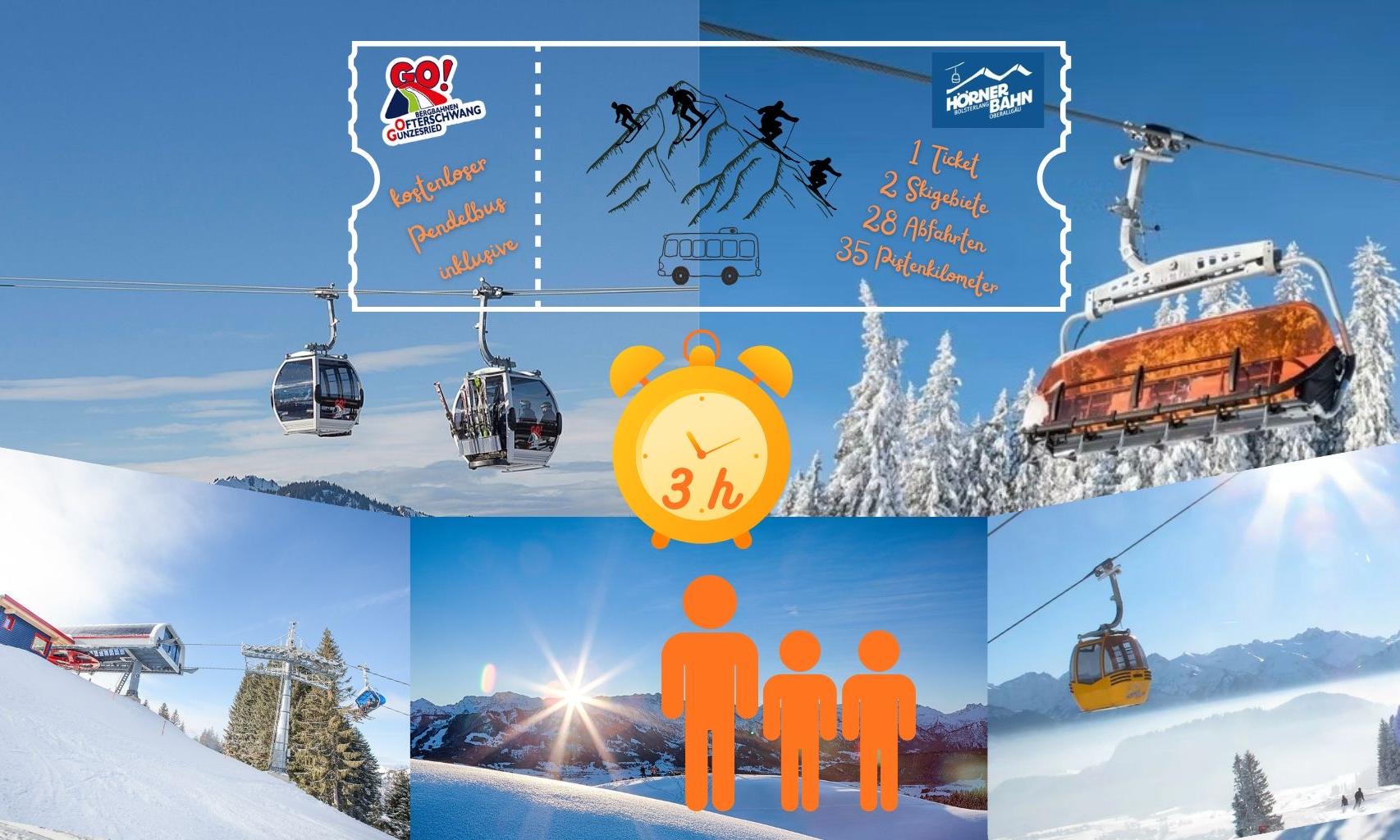 Mit nur einem Ticket können Sie 3 Stunden für ihren perfekten Skitag vollkommen nutzen. Zur Verfügung stehen gleich zwei Skigebiete mit insgesamt 35 vielfältigen Pistenkilometern für Groß und Klein. Bei optimaler Schneelage haben Sie auf 28 Abfahrten feinsten Skigenuss und die Möglichkeit mit dem kostenlosen Pendelbus zwischen der Hörnerbahn und der Bergbahn Ofterschwang-Gunzesried je nach Belieben zu pendeln. Insgesamt sind bis zu 13 Anlagen/Lifte nutzbar (ja nach tatsächlicher Schneelage).