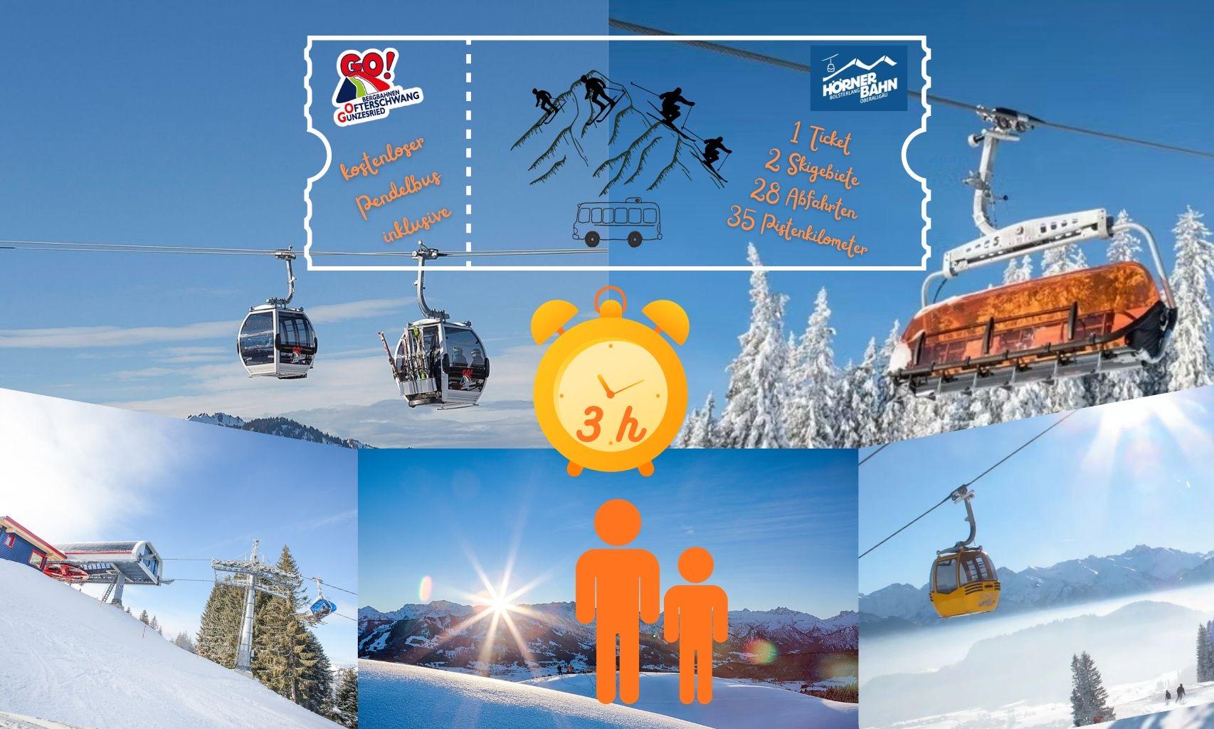 With just one ticket, you can make the most of three hours for your perfect day of skiing. There are two ski areas available with a total of 35 kilometers of varied slopes for young and old. In optimal snow conditions, you can enjoy the finest skiing on 28 runs and the option of traveling between the Hörnerbahn and the Ofterschwang-Gunzesried mountain railway as you wish with the free shuttle bus. A total of up to 13 lifts are available (depending on actual snow conditions).